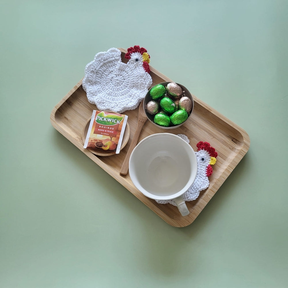 Breng een vleugje lente in huis met de charmante De kip Onderzetter – een handgemaakt accessoire dat niet alleen functioneel is, maar ook je tafel omtovert tot een sfeervol lente tafereel. Elke onderzetter is zorgvuldig gehaakt, beginnend vanuit een magische ring en opgebouwd tot een ronde basis met speelse, verende verenstructuur. De kenmerkende kam, gele snavel en expressieve oogjes geven elke kip een unieke, levendige uitstraling.