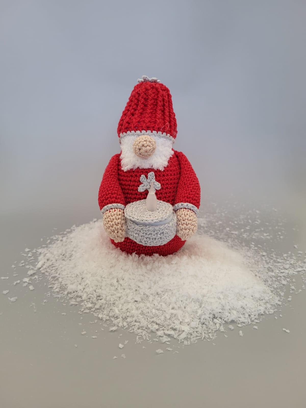 In zijn handen houdt hij een klein potje met een batterij-aangedreven lichtje, dat een zacht en gezellig gloed verspreidt – perfect voor donkere winteravonden. Elk detail is met de hand gehaakt, van zijn muts tot aan het zilverkleurige randje rond zijn kaarsje.