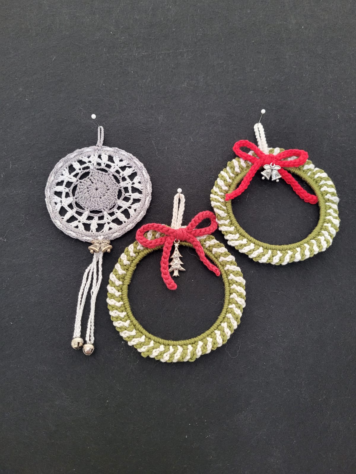 Elke krans is zorgvuldig met de hand gehaakt van hoogwaardig katoengaren en versierd met een klein metalen bedeltje en een sierlijk strikje.